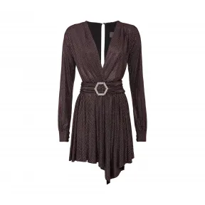 菲利普·普莱因(Philipp Plein)创造了一个特别的胶囊系列“粉红天堂”,以证明这种“浪漫”的色彩可以展现出非常“激进”的一面。这款弹力平纹针织长袖短裙采用好莱坞红地毯制成,采用点缀有斑点的水晶进行充分装饰。它的特点是低V领和不对称裙身,产生高缝。垂坠和腰带,饰有水晶装饰的六角形搭扣。后领口。中后背隐形拉链。