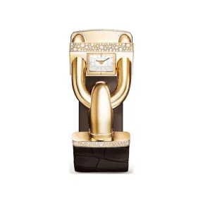 Cadenas腕表。14毫米 x 26毫米18K黄金表壳,以雪花镶嵌法铺镶圆形钻石;白色珍珠母贝表盘;18K黄金表冠;哑光巧克力色鳄鱼皮表带;18K黄金搭扣;DEF、IF至VVS级钻石;石英机芯 Van Cleef & Arpels梵克雅宝Cadenas®腕表设计夺目而隽永,正如1935年问世的原型表款一样洋溢现代时尚气息。腕表采用独具匠心的设计,配备倾斜的表盘,让佩戴者低调地读取时间,表壳的直线与表扣的曲线和谐交融一体。