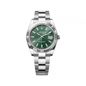 坑纹图案取自劳力士经典设计元素:部分经典表款所配备的坑纹外圈,再重新演绎,于表盘灵动活现。 三角坑纹图案表盘以传统制表材质制成,并经过超卓制表技术的精密加工,展现出隽永日志型腕表的深邃优雅气质。 坑纹图案取自劳力士经典设计元素:部分经典表款所配备的坑纹外圈,再重新演绎,于表盘灵动活现。 三角坑纹图案表盘以传统制表材质制成,并经过超卓制表技术的精密加工,展现出隽永日志型腕表的深邃优雅气质。|劳力士三角坑纹为品牌腕表的特色。起初,蚝式外圈的三角坑纹具备实际用途,有助将外圈旋紧固定在表壳上,确保腕表的防水性能。 而底盖的坑纹设计亦见基于相同的考量,并以特定的劳力士工具旋紧于表壳位置。及后,三角坑纹演变为一项美学设计元素,堪为劳力士的标志特征。时至今日,三角坑纹成为品牌腕表的特色,这款日志型 41的外圈以金制成。 劳力士三角坑纹为品牌腕表的特色。起初,蚝式外圈的三角坑纹具备实际用途,有助将外圈旋紧固定在表壳上,确保腕表的防水性能。 而底盖的坑纹设计亦见基于相同的考量,并以特定的劳力士工具旋紧于表壳位置。及后,三角坑纹演变为一项美学设计元素,堪为劳力士的标志特征。时至今日,三角坑纹成为品牌腕表的特色,这款日志型 41的外圈以金制成。|金,亮丽高贵,教人着迷。钢,坚固无比,可堪信赖。两者和谐融汇,与其他特性巧妙结合。 金钢是劳力士的标志特色,早于1930年代初已配置在劳力士表款之中,至1933年正式注册商标名称。这亦是蚝式系列其中一个显著的特征。 金,亮丽高贵,教人着迷。钢,坚固无比,可堪信赖。两者和谐融汇,与其他特性巧妙结合。 金钢是劳力士的标志特色,早于1930年代初已配置在劳力士表款之中,至1933年正式注册商标名称。这亦是蚝式系列其中一个显著的特征。|蚝式(Oyster)表带坚固舒适,集造型、功能、美学及技术于一体。 表带配备蚝式带扣,亦配备同样是劳力士独有的易调链节延展系统。佩戴者可运用此劳力士独有的巧妙装置,将表带延长约5 MM,在任何情况下均倍感舒适。 蚝式(Oyster)表带坚固舒适,集造型、功能、美学及技术于一体。 表带配备蚝式带扣,亦配备同样是劳力士独有的易调链节延展系统。佩戴者可运用此劳力士独有的巧妙装置,将表带延长约5 MM,在任何情况下均倍感舒适。|小窗凸透镜不仅是劳力士腕表的一大特色,且易于识别。 小窗凸透镜的名字源于希腊神话的独眼巨人。此装置将腕表标志的日历显示放大,让人一目了然。一如劳力士腕表的其他特色,小窗凸透镜是多年研发创新的成果,体现品牌力求完善的精神。 小窗凸透镜不仅是劳力士腕表的一大特色,且易于识别。 小窗凸透镜的名字源于希腊神话的独眼巨人。此装置将腕表标志的日历显示放大,让人一目了然。一如劳力士腕表的其他特色,小窗凸透镜是多年研发创新的成果,体现品牌力求完善的精神。|此表款配备3235型机芯,此新一代机芯全由劳力士研发制造,展现超卓的精密时计水平。 劳力士在组装表壳后,再次为这只瑞士天文台认证精密时计(COSC)进行测试,确保其精确度符合劳力士的标准,高出瑞士天文台认证时计的两倍。腕表经组装后,会以劳力士专门研究的方法和高科技设备对腕表进行最终精准度检测。 此表款配备3235型机芯,此新一代机芯全由劳力士研发制造,展现超卓的精密时计水平。 劳力士在组装表壳后,再次为这只瑞士天文台认证精密时计(COSC)进行测试,确保其精确度符合劳力士的标准,高出瑞士天文台认证时计的两倍。腕表经组装后,会以劳力士专门研究的方法和高科技设备对腕表进行最终精准度检测。 表壳:蚝式,41 MM,白色黄金及蚝式钢|蚝式表壳结构:一体成型中层表壳,旋入式底盖及上链表冠|直径:41 MM|材质:白色黄金钢(蚝式钢与白色黄金的组合)|外圈:三角坑纹|上链表冠:旋入式,双扣锁双重防水系统|镜面:防刮损蓝水晶,小窗凸透镜放大日历|防水深度:防水深达100米/330英尺||机芯机芯:自动上链机械恒动机芯|机芯型号:劳力士3235型机芯|精准:每天平均正负两秒以内(机芯装进表壳后)|功能:中央时、分及秒针;快调瞬跳日历;秒针暂停功能以准确调校时间|游丝摆轮组件:顺磁性蓝色Parachrom游丝;高性能Paraflex缓震装置|上链:藉恒动摆陀双向自动上链|动力储备:约70小时||表带表带:蚝式,三格实心链节|材质:蚝式钢|带扣:摺叠蚝式带扣配5 MM易调链节延展系统||表盘表盘:薄荷绿色,坑纹图案||认证认证:超卓天文台精密时计认证:瑞士天文台认证(COSC)+ 劳力士认证(机芯装进表壳后)||