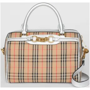 博百利/Burberry 女士 The Link - 小号 1983 格纹链环保龄球包 (银色) 80064431 的视频