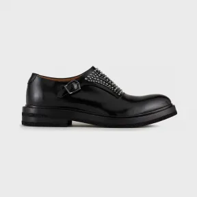 此款EMPORIO ARMANI正装鞋以个性和别致完成的精美鞋履。 臻选皮革材质制成配以装饰铆钉,彰显其光彩。 铆钉|方型鞋跟|圆头鞋头|真皮衬里|橡胶鞋底|搭扣开合|意大利制造