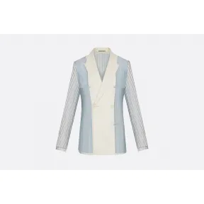 白色条纹蓝色科技帆布交叉领外套,正面配以对比鲜明的灰白色羊毛哔叽面料
