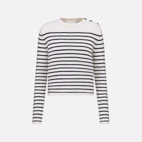 Dior Marinière 毛衣以海军蓝和白色 D 形条纹图案重现经典款式。采用轻质羊绒制成,常规版型,圆领,“CHRISTIAN DIOR”锚形纽扣精致地突出了肩部。这款毛衣可搭配该系列的牛仔裤或半身裙,打造标志性造型。“CHRISTIAN DIOR”锚扣|100% 羊绒(5 号)*|意大利制造|