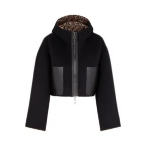 两面穿中长款贴袋兜帽夹克,采用短圆袖设计。双头拉链开合。黑色双侧羊毛布料材质。同色系皮革口袋。内衬饰有全幅FF图案。意大利制造