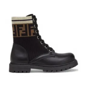 黑色皮革儿童机车靴,饰有弹力布料嵌件。袜状靴筒上饰有FF图案和撞色条纹。意大利制造