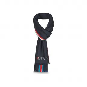 -70x200厘米-100%羊毛-末端右侧饰有对比色路易威登英文刺绣-源自经典LV旅行箱的条纹元素-边缘饰有流苏动感又优雅的都市造型配饰,手感柔软丝滑的纯羊毛围巾。经典海军蓝Monogram花纹搭配彩色条纹与LV字母刺绣。宽大的设计尺寸,时尚又保暖。