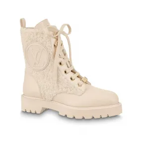 这款经典Territory军靴以冬日风格重新演绎,选用小牛皮和羊毛制作,缀有丰富细节,包括LV Circle标志、侧面的压花缝线皮革贴饰、金色孔眼和蕾丝装饰,创作灵感源自军靴款式,并以厚实的橡胶鞋底作完美点缀。