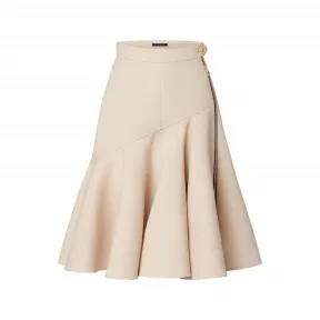 本款及膝半身裙取材优雅绵羊毛卡迪绉绸,以不对称荷叶边舞动量感,定义柔美基调。侧面明拉链注入反叛气息,开启即可流露妩媚意味。黄铜 LV 纽扣点缀腰际。