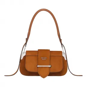 Prada Sidonie手袋初次亮相于Prada 2019早春秀,灵感来源于Prada 2000春夏系列和经典Cahier手袋,致敬过去,面向未来。两角复古的金属片设计汲取自1913年Mario Prada先生的高级行李箱制作,与现代派的包型形成了微妙的平衡。该款Prada Sidonie单肩包以麂皮打造而成。肩带线条流畅,超大翻盖和金属搭扣分外醒目。 双色麂皮小牛皮|可拆卸皮革提手|可拆可调式皮革肩带|正面翻盖及系带|金属刻字徽标|内袋|软羊革衬里|14 cm 高度|28 cm 长度|4 cm 宽度