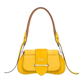 Prada Sidonie手袋初次亮相于Prada 2019早春秀,灵感来源于Prada 2000春夏系列和经典Cahier手袋,致敬过去,面向未来。两角复古的金属片设计汲取自1913年Mario Prada先生的高级行李箱制作,与现代派的包型形成了微妙的平衡。该款Prada Sidonie单肩包以麂皮打造而成。肩带线条流畅,超大翻盖和金属搭扣分外醒目。 双色麂皮小牛皮|可拆卸皮革提手|可拆可调式皮革肩带|正面翻盖及系带|金属刻字徽标|内袋|软羊革衬里|14 cm 高度|28 cm 长度|4 cm 宽度