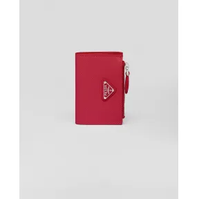 Refined card holder with a modern design in Saffiano leather decorated with the iconic enameled metal triangle logo, which first appeared on trunks designed by Mario Prada in 1913. Product code: 1MC085_QHH_F068Z| Snap closure| Enameled metal triangle logo| One card slot| One internal pocket| Internal zipper coin compartment| One external pocket| Moiré and Saffiano leather lining| Height: 7cm| Width: 10cm|