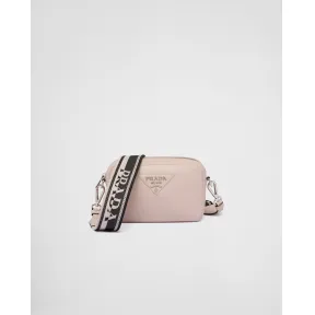 This small leather shoulder bag with soft lines is decorated on the front with a reinterpretation of Prada's classic logo, with a stitched triangle and metal lettering that stands out at the center. The logo-embroidered shoulder strap adds a versatile and modern touch to the accessory. Product code: 1BH192_2DKV_F01U0_V_3OO| Detachable, adjustable 95 cm logo-embroidered woven shoulder strap| Detachable, adjustable 100 cm leather shoulder strap| Metal hardware| Metal lettering logo on the front| Zipper closure| Logo-print nylon lining with patch pocket| Height: 12cm| Length: 6cm| Width: 19cm|