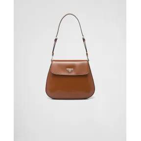 The Prada Cleo bag with sophisticated allure reinterprets an iconic design of the brand from the 1990's. Sleek curved lines emphasized by the particular construction rounded on the bottom and sides give this flap bag a soft, light look. Brushed leather, a modern and versatile material that is distinctive in Prada collections, is ideal for creating always new combinations and contrasts. The enamel triangle logo decorates the silhouette. Product code: 1BD316_ZO6_F02TX_V_HOO| Handle with leather shoulder strap for crossbody wear| Metal hardware| Enameled metal triangle logo| Magnetic flap closure| Nylon logo lining and inner patch pocket| Height: 22.5cm| Length: 4cm| Width: 28cm|