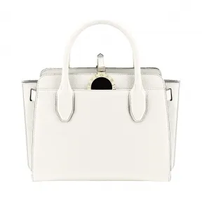 托特包“BVLGARI∙BVLGARI Alba”白玛瑙粒面小牛皮托特包,配以拉链封口。浅金镀金黄铜吊坠,正面为黑色珐琅,背面为皮革,搭配经典双Logo标志和Tubogas图案。内部拉链口袋,三个侧边扣板,一条内置拉绳用于调节包口的大小。可调节、可拆卸皮革肩带。小号,另有其他颜色可选。25 x 20 x 9.5 厘米 - 9.8 x 7.8 x 3.7 英寸