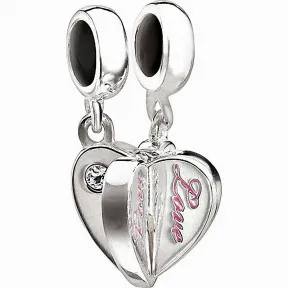 Designed as a two-part friendship bead, this sterling silver design is a gift that every girl will love! Identical hearts are adorned with Light Rose and clear crystals, both reading Love Forever in pink epoxy. Keep one and give the other to a beloved one, and you will be forever connected. This product is part of the Swarovski Chamilia collection.