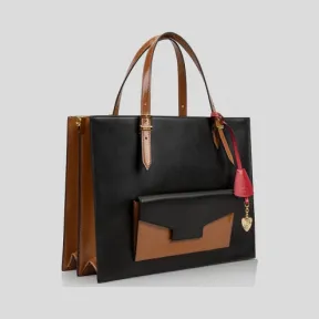 高光泽度的黑色和棕褐色皮革赋予这款手提袋精致的外观。它的设计适合工作和个人物品,并配有可拆卸的金色心形装饰品。 两音色皮革|可调节的顶部手柄|前袋,两个拉链顶部隔层|浅金色配件|签名心形吊饰|意大利制作|材料:100%小牛皮|里料:100%小牛皮|厘米尺寸:35.5W x 27H x 15D