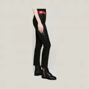 优质的材料和意大利做工打造出这款时尚的皮革裤子。自然的弹力特性确保灵活的合身性,而生动的红色腰带则增添了俏皮感。 弹力羊皮革|修身版型|五口袋款式|撞色腰带|品牌五金|材料:100%羊皮革