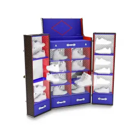 Monogram涂层帆布微纤维衬里牛皮饰边金色金属件白色牛皮手柄锁扣开合配搭扣14个透明Perspex Monogram间隔可展示运动鞋7个抽屉可放鞋履护理用品及配件手柄:双这款Malle Sneaker NBA是LV与NBA联乘限量系列的款式之一,独一无二的行李箱专为运载及展示运动鞋列而设,亦可收纳其他随身物品。行李箱以传统的Monogram帆布和牛皮饰边打造,饰有NBA标志图案,采用红色及蓝色的微纤维衬里,内有8个为高筒运动鞋而设的间隔,另有6个低筒鞋款间隔,而每个间隔均配有缀以Monogram图案的有机玻璃抽屉。